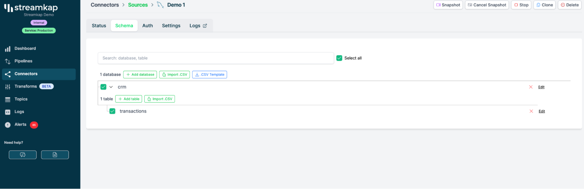 이 구성을 완료하면 Streamkap이 SQL Server에 연결하여 테이블을 자동으로 탐지합니다. 이 데모에서는 events나 transactions처럼 이미 데이터가 스트리밍되고 있는 테이블을 하나 선택합니다.