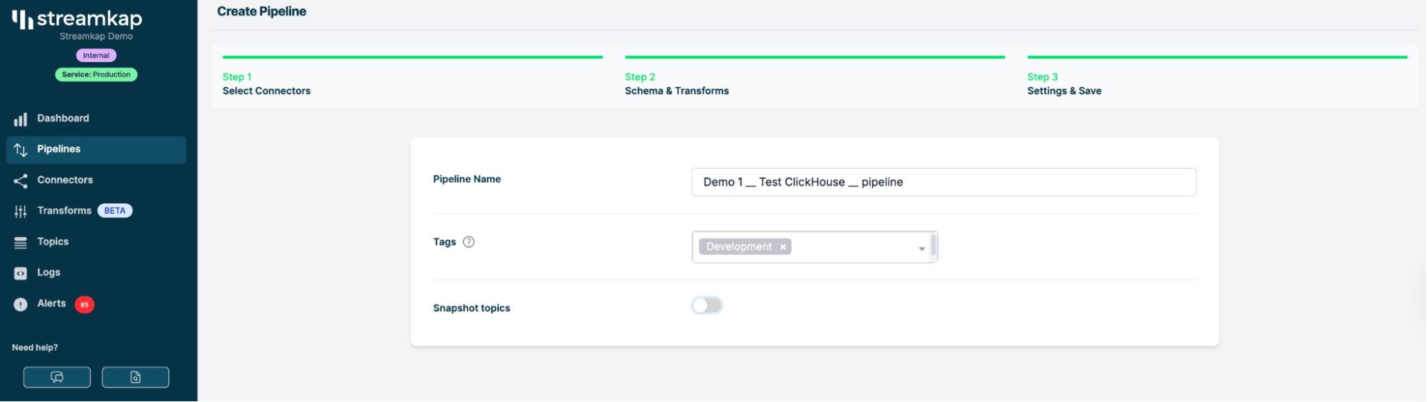 3단계: Streamkap에서 파이프라인을 설정하기